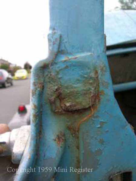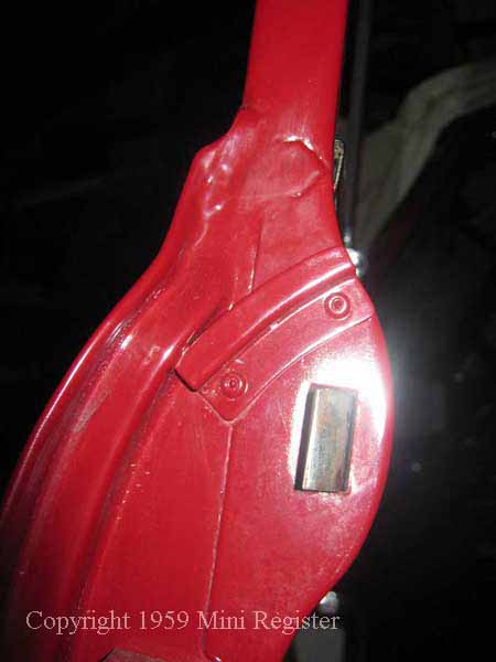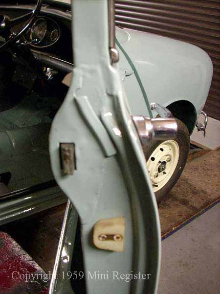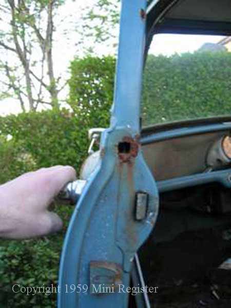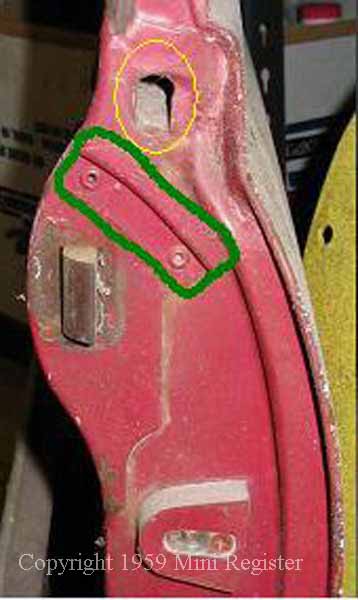 Mid 1960 door showing the lock protector still riveted in place but the drain hole is now through the conventional rubber hose through the bottom of the door.  The defector would later be incorporated in to the door moulding rather than riveted on separately. Later Mk1 style door showing the water deflector plate as part of the door pressing.