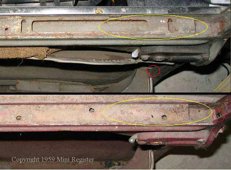 The addition of a riveted drain to deflect the water away from & protect the door lock mechanism. The top door shows the door channel on later doors, circled in red you can just see the rubber tube in the frame to let out the water through the bottom of the door. The lower red 59 type door shows where water was lead through into the channel and then through the door ends circled in red.