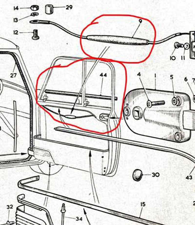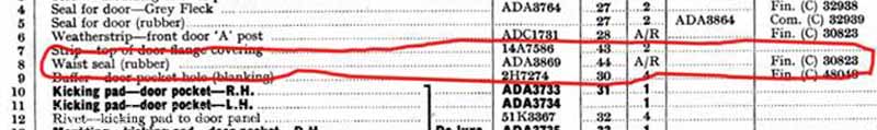 Number 44 in the above picture shows the weather seal. This image shows the entry in the parts book, item no 8.  Weather seal (rubber) part number ADA3869, illustration no 44, as required up to car Morris chassis number 30832 when the new style door was introduced.