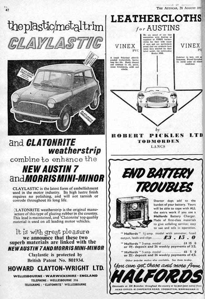 August 1959 Autocar showing the proud advertisement for the Claylastic chrome look strip on the de-luxe models