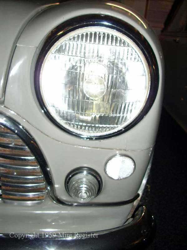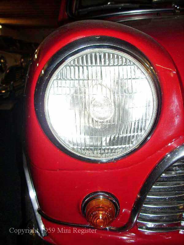 Pre focus Lucas 700 head lights were used in both LHD and RHD configurations.  An orange lens was used on the indicator. In some export markets like Denmark and South Africa the side lights were incorporated in to the front indicator so there is no side light provision in the head light and a clear lens on the indicator.