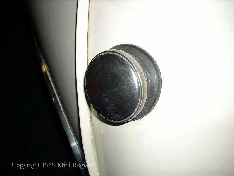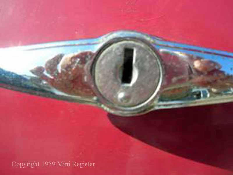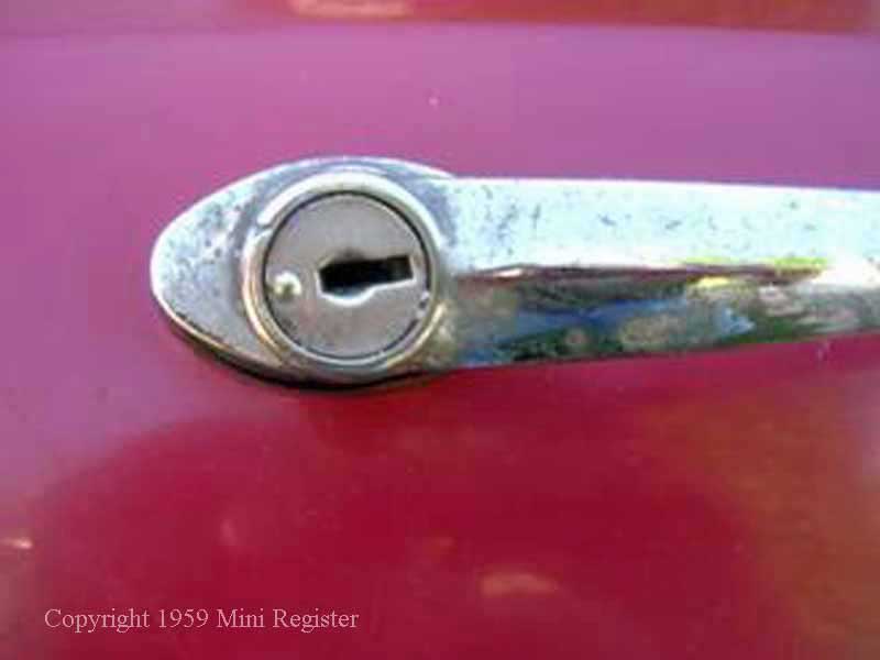 The driver’s door lock has a key hole, the passengers does not.  But this small round lump is present on all 59/60 locks near the key hole. A Boot lock handle showing the lump.