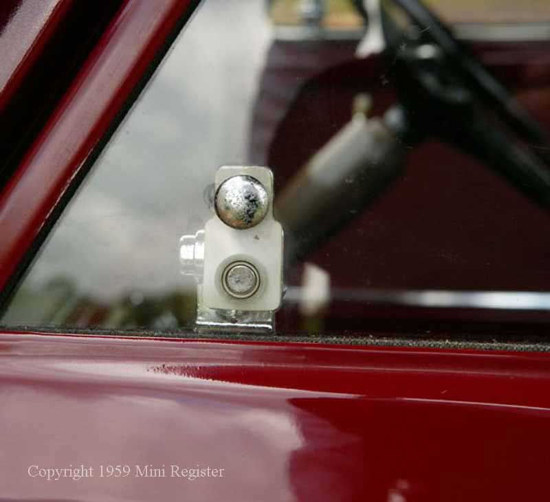 One hole glass and catches without the bottom locating dowl.  These were fitted until early 1960.  However some late 59 Morris cars have been found with 4th quarter dated two hole glass. A two hole catch and glass showing the lower locating dowl to stop the catch rotating.