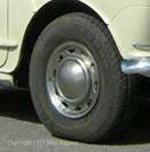 De-luxe cars have this style of wheel trim fitted with rectangular holes.  The trim does not fully cover the steel wheel underneath. Basic cars had small disc type hubcaps fitted.