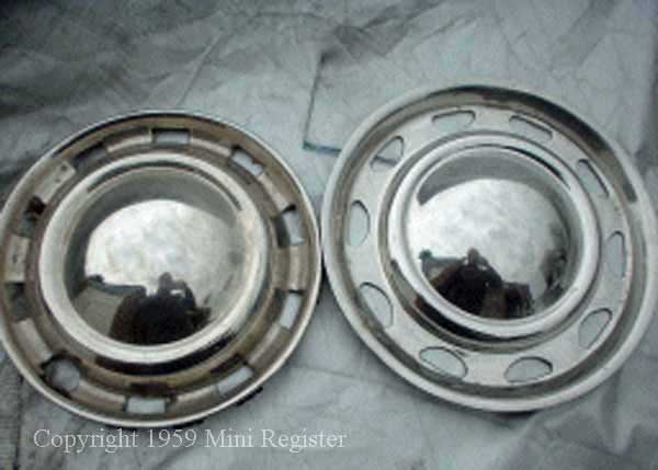 Later style full size hubcaps with half moon cut outs, this style were never fitted to 59 built cars. 59 style hub cap next to a late 60> style.