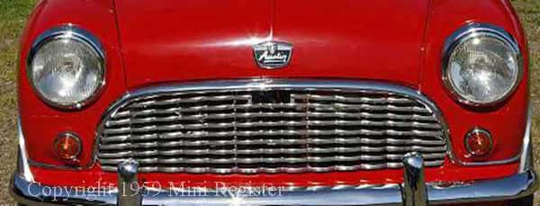 Austin wavy chrome grill fitted to all 59 Austins.  This photo also shows the correct bonnet badge for Austin. Morris painted pressed grill, fitted to all Morris 59’s.  This photo also shows the correct bonnet badge for a 59 Morris.
