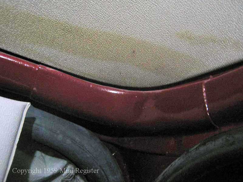 | Early headlining material looks like this on the left. The parts book only lists one headlining well into 1962. However by the end of July 1959 this type of headlining was replaced by the more common type on the right. | The early style head lining was replaced by this by 1960 but we have no change point. No 1959 car had the cream crackle type head lining. |